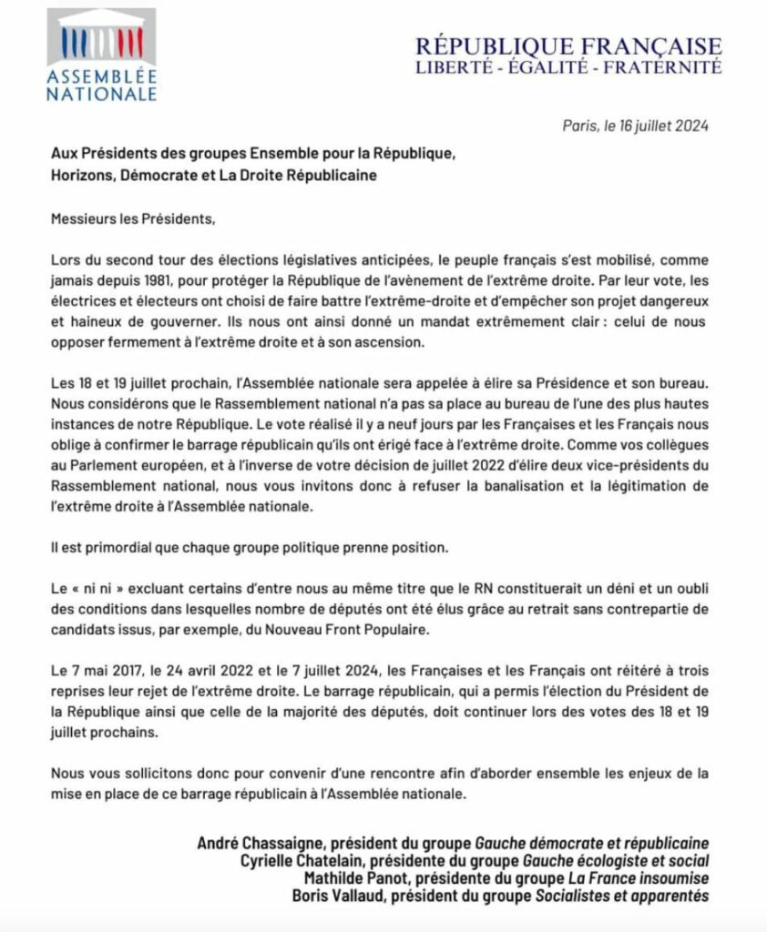 Alors que nos concitoyens se sont massivement mobilisés pour faire barrage à l’extrême droite dans les urnes, il est de notre responsabilité d’élus de respecter le mandat qui nous a été donné. C’est la raison pour laquelle, avec mes collègues du groupe écologiste, j’appelle depuis le 7 juillet à prolonger le barrage républicain au delà […]